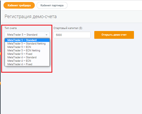 После этого выбираем «Тип счета». Важно указать используемую вами версию рабочей платформы, поскольку торговый счет создается под конкретную версию терминала.