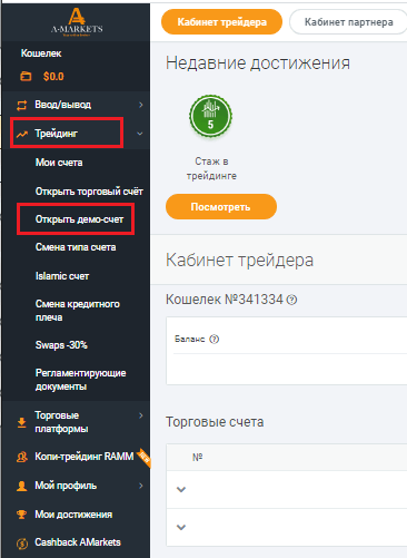 Давайте посмотрим, как открыть тренировочный аккаунт, Для этого воспользуемся услугами онлайн брокера AMarkets. Итак, первым делом создаем личный кабинет. В Личном кабинете в меню находим строку «Трейдинг», а там «Открыть демо-счет».