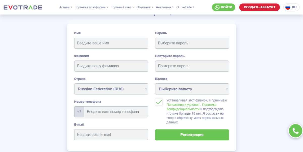 Первый шаг. Открытие главной страницы меню брокера. Официальный сайт расположен на веб адресе https://evotrade.com/ru.