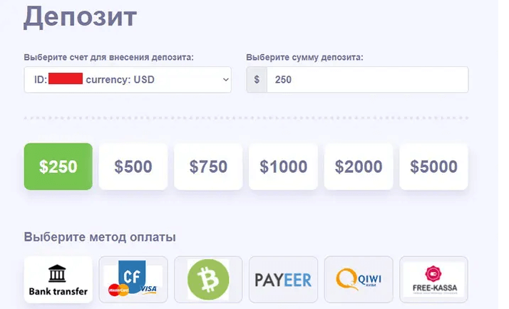 - Минимальный депозит составляет всего 250 долларов или в рублях по текущему курсу. Причем это относится, как к реальному счету, так и к его демо — версии. Единственное отличие — в демо варианте, клиенту начальный депозит в 250 долларов предоставляется бесплатно.