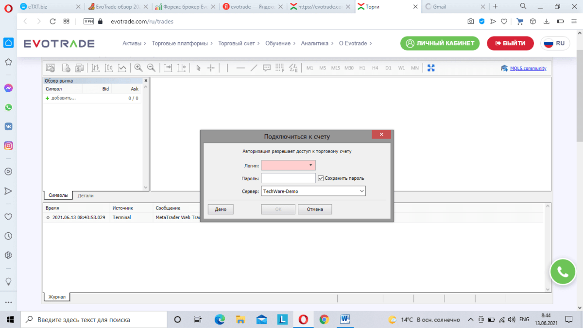 Шаг шестой. Как только будет осуществлен вход в меню демо — версии, перед пользователем появится страница с торговым терминалом. У брокера Эво Трейд в качестве базы используется торговая платформа МТ-5 (Мета Трейдер).
