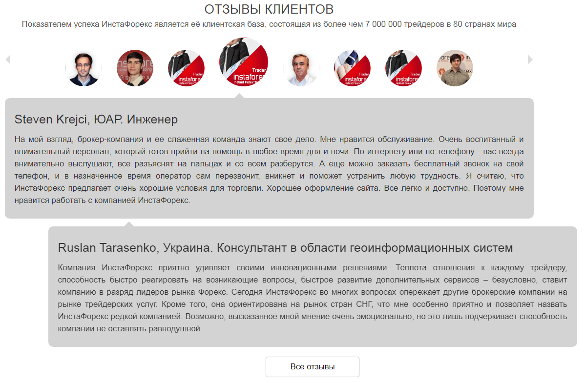 Мнения о себе брокер выделил в отдельную опцию; нужно отметить, что на центральной странице сайта видны только позитив, но ведь ее задача – реклама и привлечение клиентов. На самом деле негативные отзывы компания не прячет − если перейти в основной раздел, то можно прочитать всю информацию. Независимый анализ отзывов об InstaForex на внешних ресурсах можно почитать здесь.