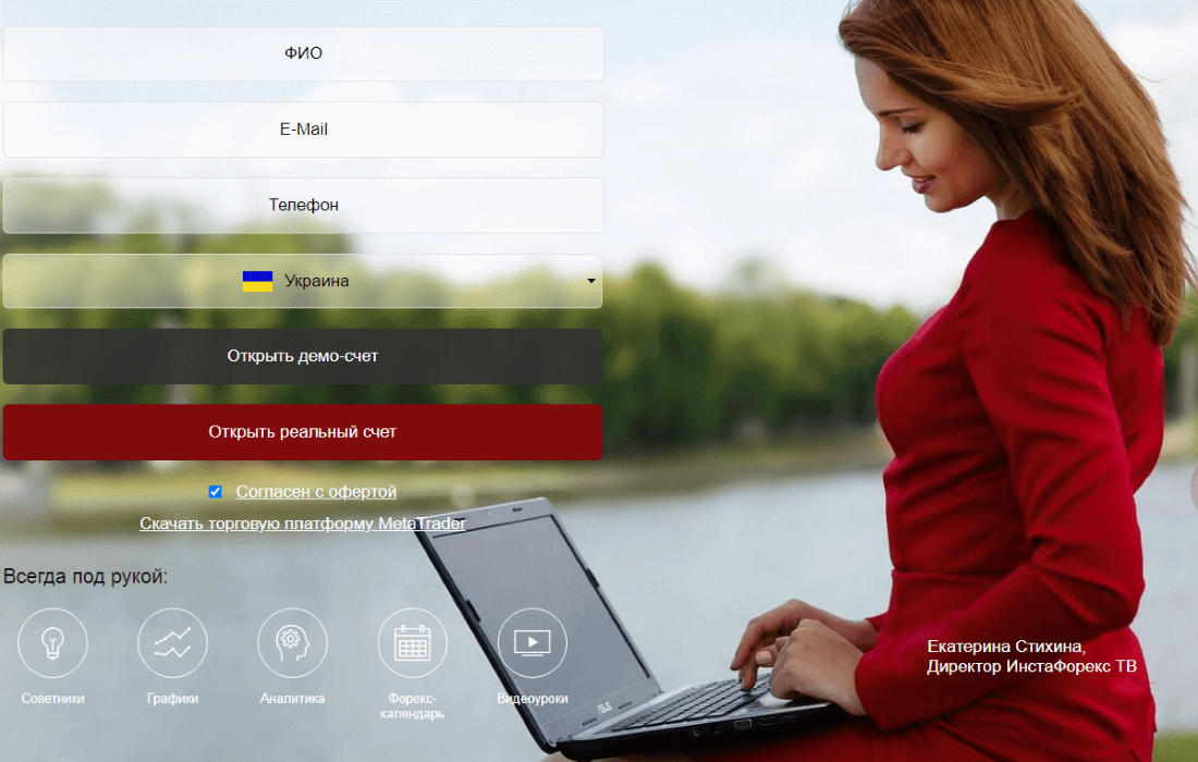 Ну и последний, вполне логичный аргумент для тех настойчивых, которые пролистали центральную страницу до конца – приглашение открыть счет от обаятельной сотрудницы Инстафорекс ТВ. Заполняем, открываем демо счет или реальный депозит и отправляемся в поход за профитом.