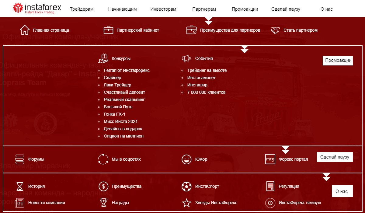 Здесь собрана вся необходимая информация для человека, который уже познакомился с компанией и реально готов работать. Но и рекламные, и новостные опции также доступны, так что вы всегда будете в курсе событий. Особый раздел выделен для партнеров компании.