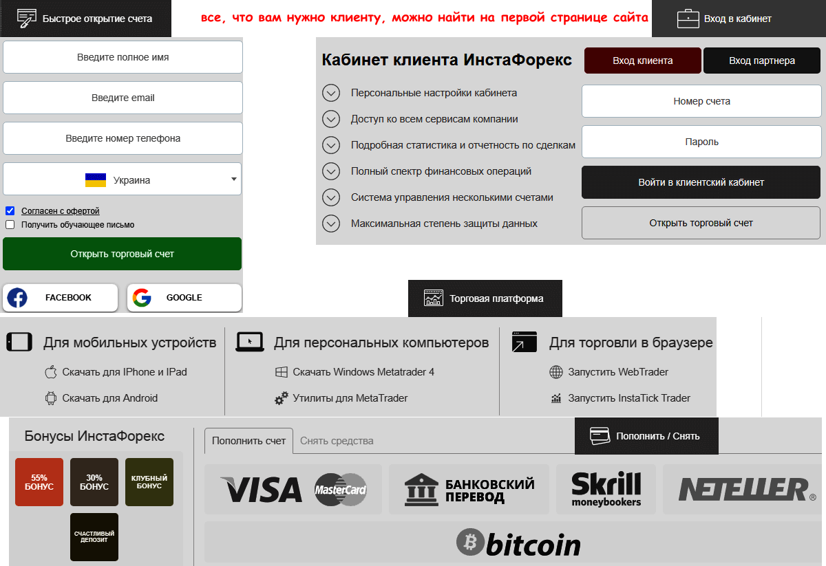Тем пользователям, кто привык пользоваться традиционной схемой доступа к информации, сайт Инстафорекс предлагает привычную систему иерархических меню, без рекламы, лишних кнопок и других отвлекающих подробностей. Все рационально организовано и интуитивно понятно.
