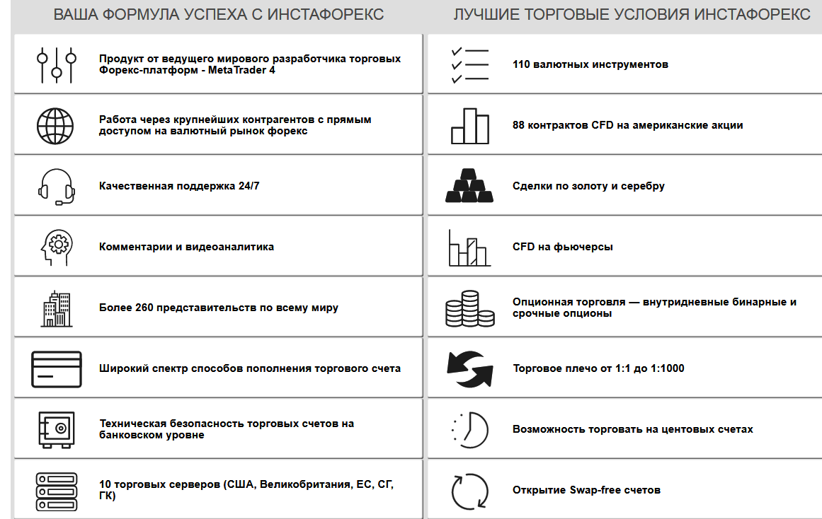 На следующей странице расположена сводная страница с информацией о технических условиях и торговых активах – все опции кликабельны − можно почитать подробную информацию. Интересно, что Инстафорекс − один из немногих крупных форекс-брокеров работает со всеми видами акций и опционов, включая бинарные. Огромное количество активов, широкий диапазон кредитного плеча, центовые и swap-free счета – отличные условия для мелких трейдеров.