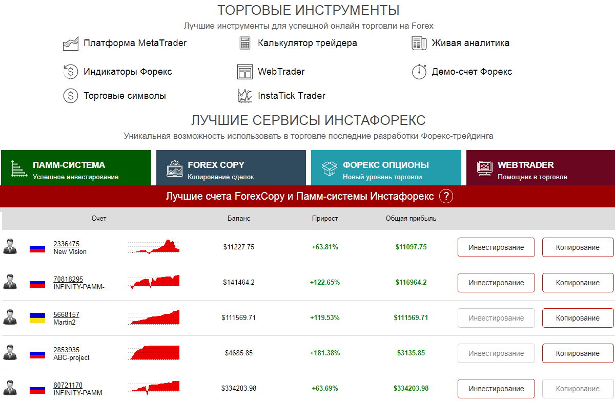 В разделе «Услуги Инстафорекс» информация по ПАММ-счетам обновляется в реальном времени, подробная информация и подключение к инвестированию в проект и копированию сделок доступны в один клик. На отдельную вкладку вынесены товарно-сырьевые и бинарные опционы с прямым доступом к торговой платформе.