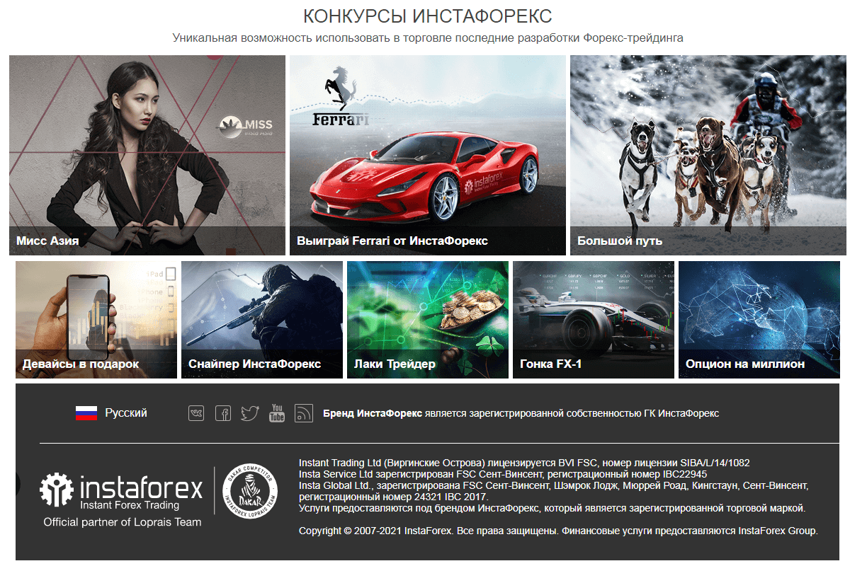Акции Инстафорекс действительно глобальные – от инвестирования в автогонки до конкурсов красоты и трейдерских гонок на депозитах. Как говорится, на любой вкус и сумму.