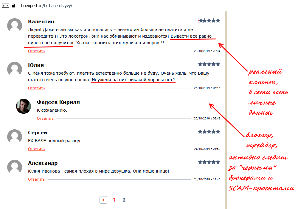 Реальные отзывы о FX Base показывают, что компания использует все, даже самые невероятные формы шантажа и давления на клиента: вас будут снова и снова разводить на оплату каких-то комиссий, страховок, налогов(!), госпошлин (?), получение «федеральной печати» (??) и прочей чепухи.