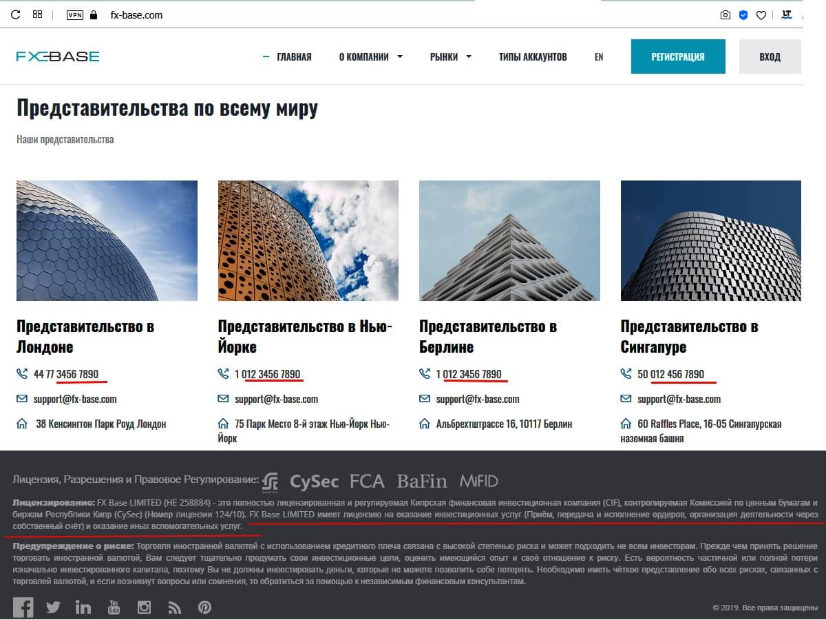 Первое подозрение о том, что FX Base – стандартный SCAM-проект, возникает после изучения списка разрешений от регуляторов, которые якобы имеет брокер. Внешне выглядит солидно: три уважаемых организации, но никаких реальных ссылок или документов, даже хоть какой-нибудь скан-копии, в этом разделе нет. О странных телефонных номерах (из простой последовательности 0123456789) и фальшивых адресах этих «представительств» мы (и не только мы!) уже писали.