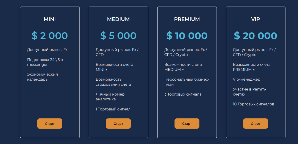 - Минимальная сумма для открытия счета — 5000$. Позволяет осуществлять операции валютными активами рынка Форекс и CFD контрактами. Клиентам предоставляются услуги аналитика.