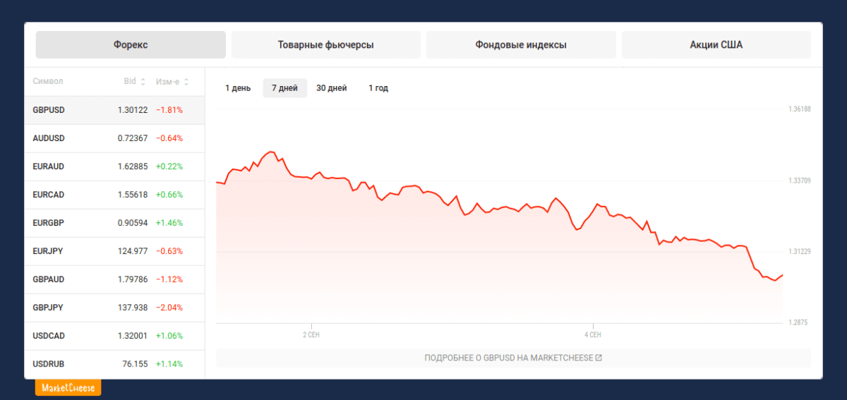 Гордо названый аналитическим раздел — текущее отображение графика по инструментам на валютном, товарном и фондовом рынках.