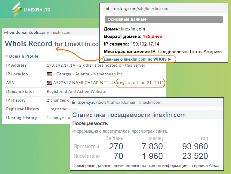 На первый взгляд все хорошо и можно пополнять депозит. Но, давайте «включим скептика» и постараемся проверить правдивость заявлений Linexfin LTD. Начнем с возраста и посещаемости домена компании по открытым источникам. Результаты, мягко говоря, не веселые: