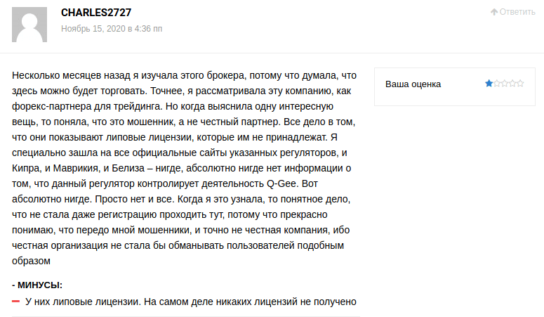 Следующий фидбек подтверждает все сделанные нами ранее выводы — предоставление поддельных номеров лицензий характеризует Q-Gee как мошенников.