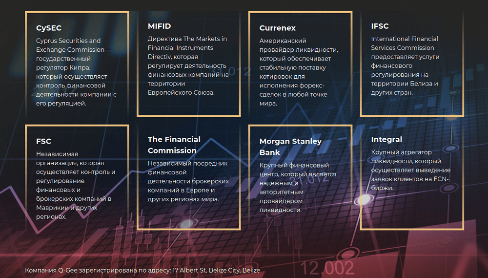 В списке сотрудничающих с Q-Gee организаций приводятся как международные регуляторы, вроде CySEC и FSC, так и крупные банковские структуры — Morgan Stanley и ведущие поставщики ликвидности. Остается загадкой, знают ли в указанных компаниях о сотрудничества с брокером. Поиск лицензий на сайтах регуляторов по указанным на странице Q-Gee номерам не увенчался успехом. Первый маркер ненадежного брокера компания получила. Подобным посредникам проще совсем не декларировать на своих сайтах номера несуществующих лицензий, чем пытаться показать обратное. В Q-Gee решили пойти на обман открыто.