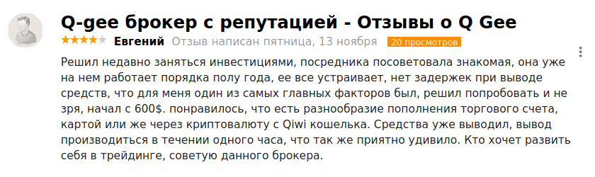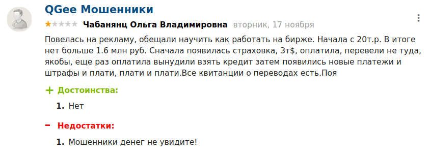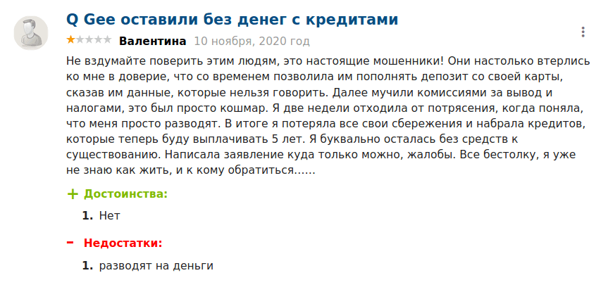 Отзывы о Q-Gee можно найти как положительные, так и отрицательные. Их соотношение примерно одинаково. Но этот факт не должен вводить в заблуждение — компания мошенническая. И тот факт, что в Сети можно найти клиентов, сумевших вывести отсюда средства, при том, что никакой информации о возможных способах перевода денег с торгового баланса нет, говорит о мощной фейковой поддержке компании.