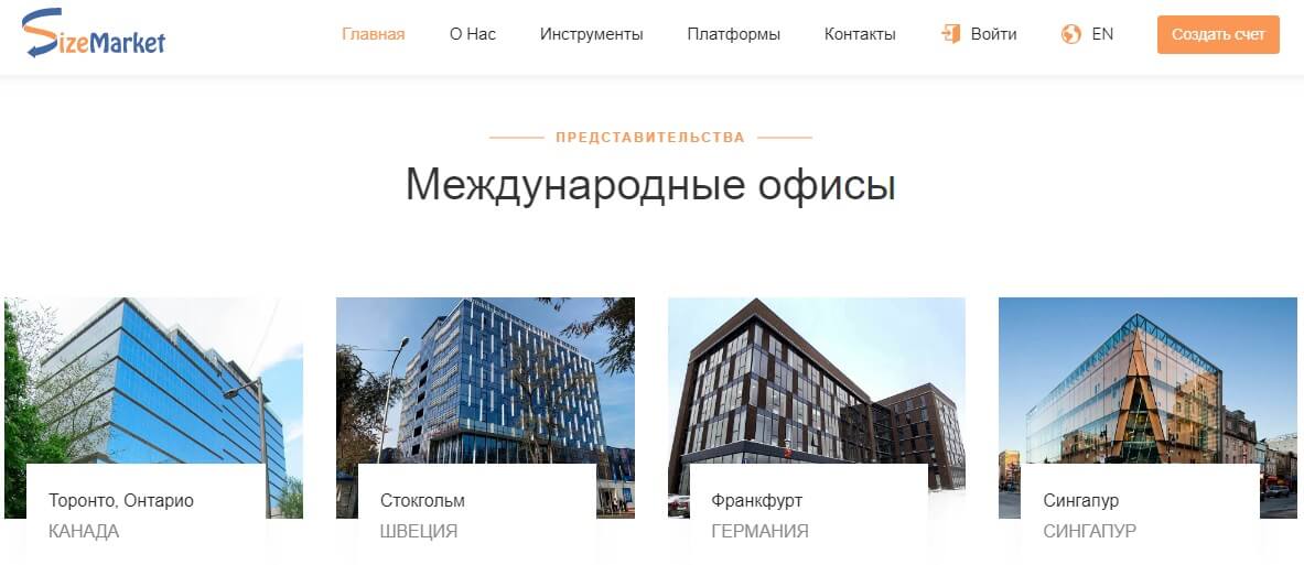 Size Market позиционируется в качестве международного брокера, имеющего представительства по всему миру, однако при этом в разделе «Контакты» для связи с сотрудниками организации представлены только адрес электронной почты и форма обратной связи.
