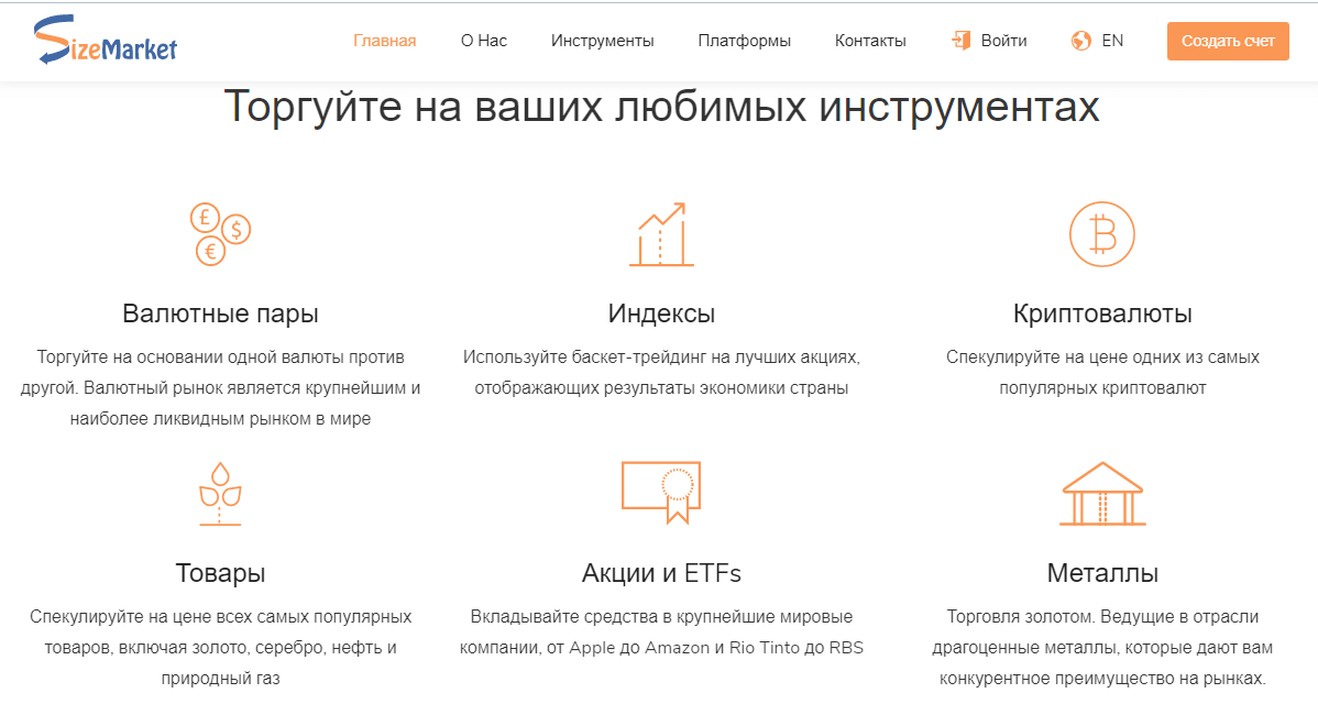 Официальный сайт компании доступен по адресу size-market.com. Организация позиционируется в качестве надежного посредника на финансовых рынках с многолетним опытом работы. На сайте предусмотрен раздел «О компании». Обычно на этой странице представлена важная информация об организации, истории ее формирования и развития, а также сведения об учредителях. По всей видимости, администрация ресурса не сочла важным раскрывать подобные данные. При переходе в упомянутый раздел пользователь увидит лишь опубликованный материал рекламного характера.