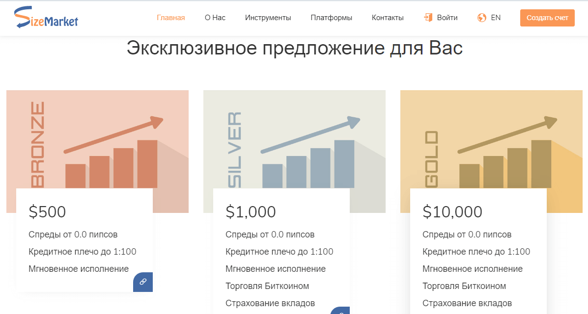Теперь стоит ознакомиться с торговыми условиями. Как видно, минимальный депозит для начала торговли составляет 500$, при этом потенциальным клиентам гарантируют рыночные спреды и кредитное плечо на уровне 1:100. Обратите внимание, что чем выше капитал трейдера, тем больше уровень финансовой поддержки брокера. Обычно все наоборот. Например, при открытии торгового счета в одном из европейских банков и при его пополнении на сумму от 1000$, значение кредитного плеча составит не более 1:100. При инвестировании в торговлю через банк от 100 000$ клиент может рассчитывать на получение банковских гарантий, а также на финансовую поддержку в размере 1:1 или 1:5, но не более. Торговые условия компании Size Market лишь доказывают, что при сотрудничестве с этим брокером не стоит рассчитывать на вывод сделок на межбанковский рынок.