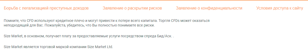 Внимание! Деятельность брокера должна контролироваться компетентными регуляторами. Для трейдера это является своего рода гарантией прозрачности бизнес-модели компании, что предполагает предоставление клиентам прямого доступа к межбанковской ликвидности и отсутствие конфликта интересов. На главной странице сайта компании Size Market упоминается перечень активов, однако при этом ни слова не говорится о поставщиках ликвидности.