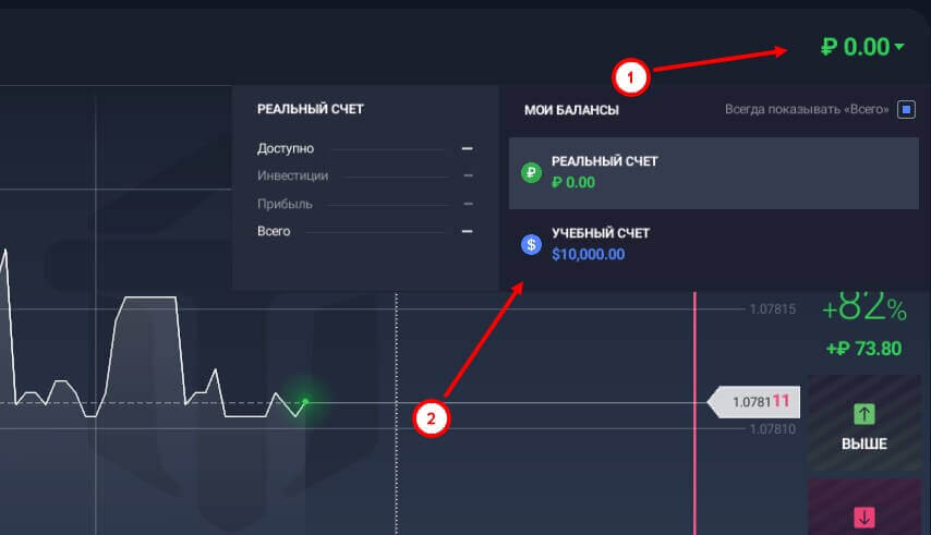 Пользователям доступно два вида счетов: реальный и учебный (демо-режим). Каждый может получить нужные знания и опыт активировав второй, тем самым получив 10 000 виртуальных долларов для тестирования своих торговых стратегий. Переключится на учебный счет и обратно на реальный достаточно легко – в правой части, где указан баланс нужно нажать на стрелочку, и откроется выбор счета.
