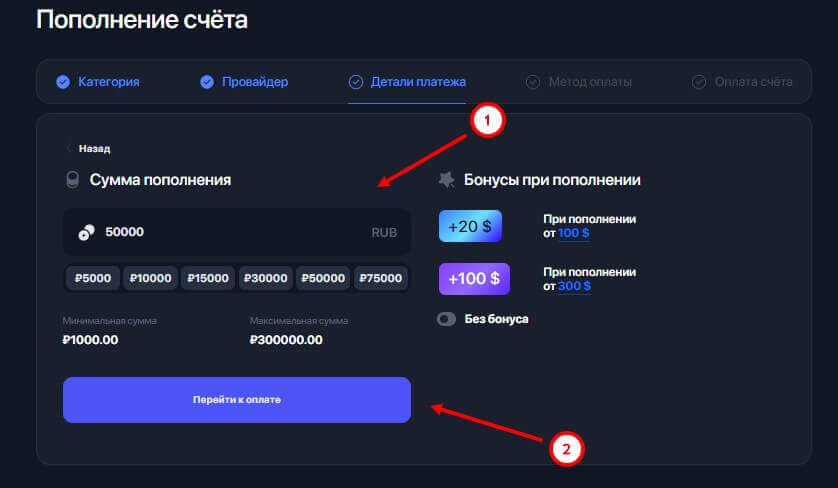 После выбора появится поле для ввода суммы пополнения. Для рублевых счетов сумма равняется минимум 1 000 рублей. Также следует заметить то, что при пополнении конкретной суммы биржа предоставляет бонусы: от 100$ бонус в 20$ и от 300$ бонус в 100$. После ввода суммы нажимаем на кнопку “Перейти к оплате”.