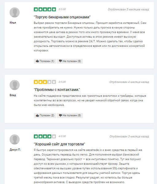 Брокер бинарных опционов AezaTrade обладает положительной репутацией со средней оценкой в 4,5 баллов. Клиенты отмечают то, что компания предлагает удобный интерфейс, хотя некоторые с этим не согласны, поддержку криптовалют при пополнении и множество других. Однако имеются и негативные отзывы от пользователей, которые скептически относятся к такому виду заработка. Вот небольшая подборка отзывов, которые оставляют клиенты и пользователи интернета.
