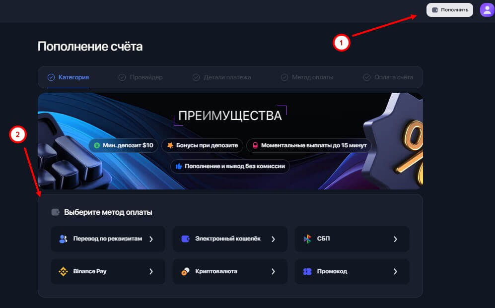 Совершить депозит можно, нажав на кнопку “Пополнить” в верхней панели, после чего откроется список способов для пополнения: перевод по реквизитам, электронные кошельки, криптовалюты, Система Быстрых Платежей (СБП), BinancePay или введя промокод.