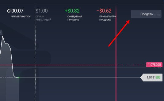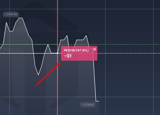 В случае неуспешной сделки, рядом с линией экспирации появится сообщение “Результат (P/L) –$1, если ставили доллара или другая сумма, которая была указана при проведении сделки.