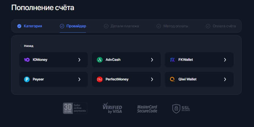 Затем выберите провайдера. В качестве примера пополним электронным кошельком, где можно выбрать Юмани, AdvCash, FKWallet, Payeer, Perfect Money, Qiwi кошелек.