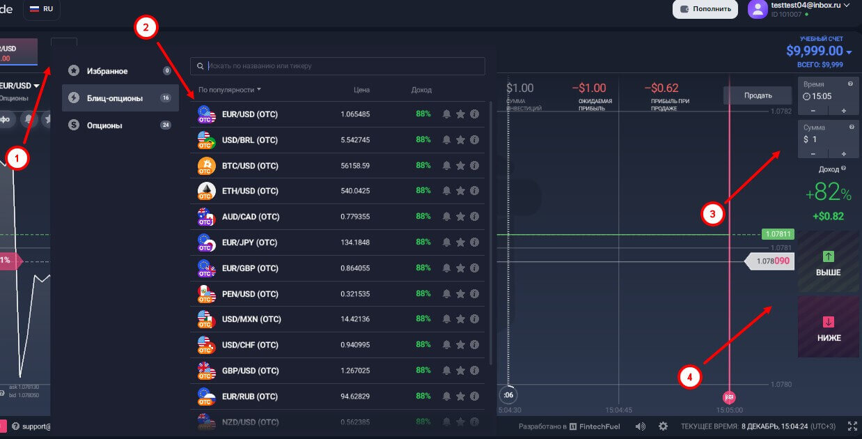 Теперь можно начать торговать. Чтобы совершить сделку, необходимо нажать на иконку “+” и выбрать любую из торговых пар. Доступны как блиц-опционы, так и обычные. Затем укажите сумму сделки и нажмите на “Выше” или “Ниже”. По графику можно следить куда пойдет цена, время покупки (до этого момента нужно приобрести) и экспирации (время ожидания).