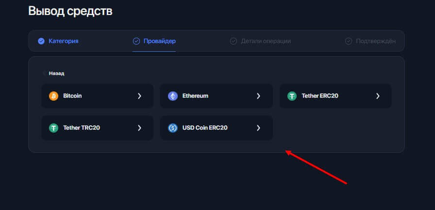 Для примера выбрали “криптовалюта”. Затем появится список провайдеров (в нашем случае криптовалют), среди которых BitCoin, Etherium, Tether по протоколу ERC 20 и TRC20 и USD Coin по протоколу ERC20.