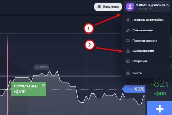 Чтобы снять средства со счета, нажмите на стрелочку в верхней части страницы, где указан ваш ID. Откроется всплывающее меню, где следует кликнуть на кнопку “Вывод средств”.