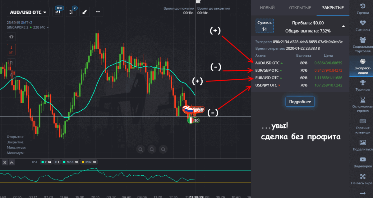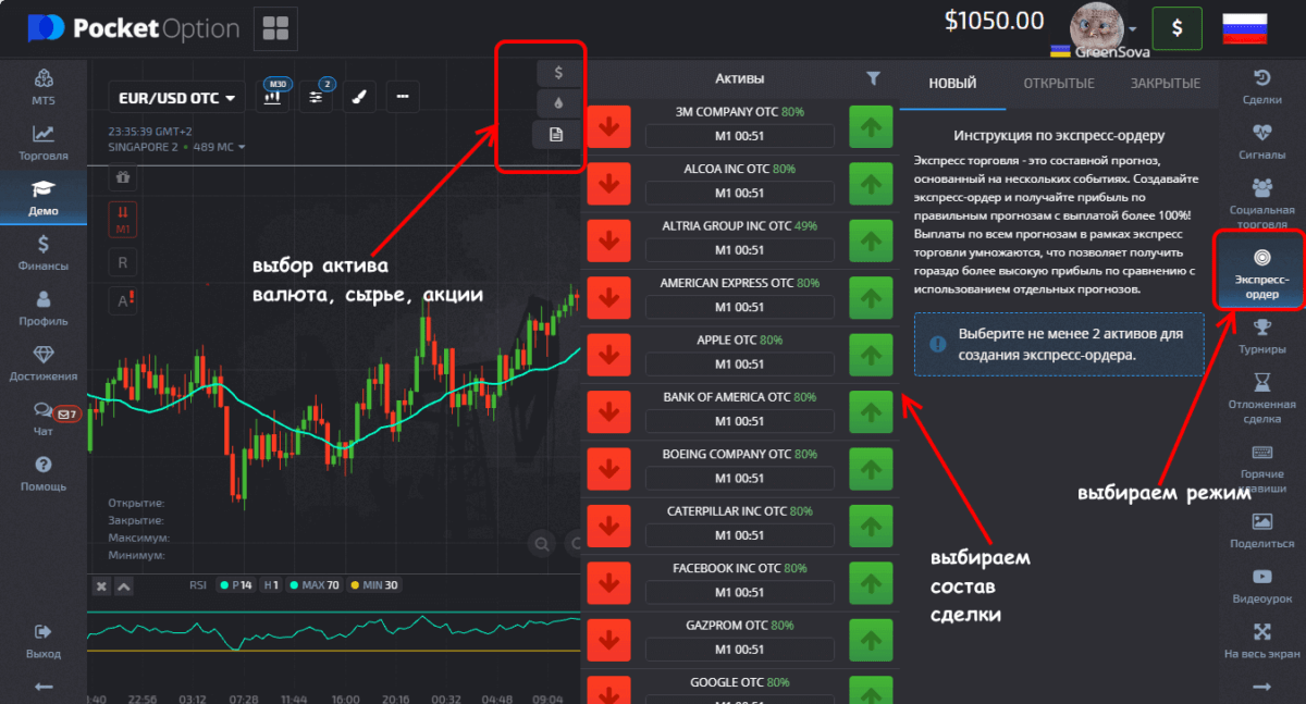 Представьте себе классические опционы типа «Выше-Ниже», но по нескольким инструментам одновременно – просто одной кнопкой. Если для успеха по обычному опциону достаточно сделать правильный прогноз по одному активу, то для успеха экспресс ордера Pocket Option понадобится точная оценка по КАЖДОМУ активу в составе сделки. Это значительно усложняет необходимый анализ до входа в рынок, но и потенциальная прибыль получается в несколько раз выше обычной.