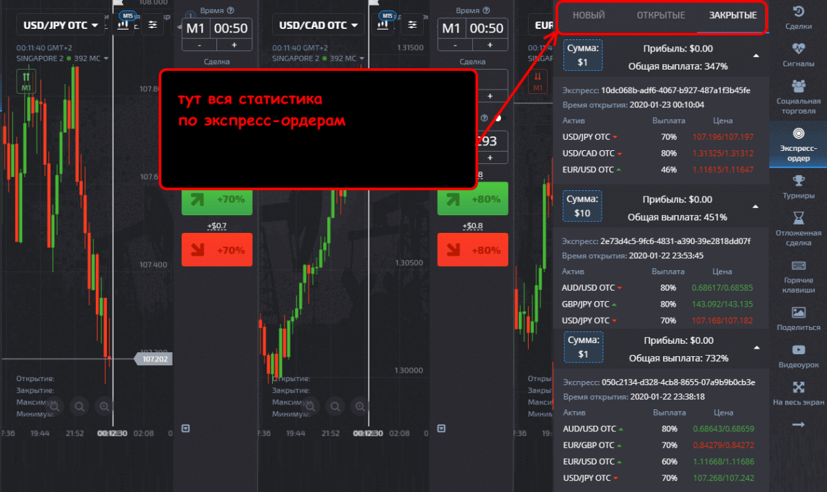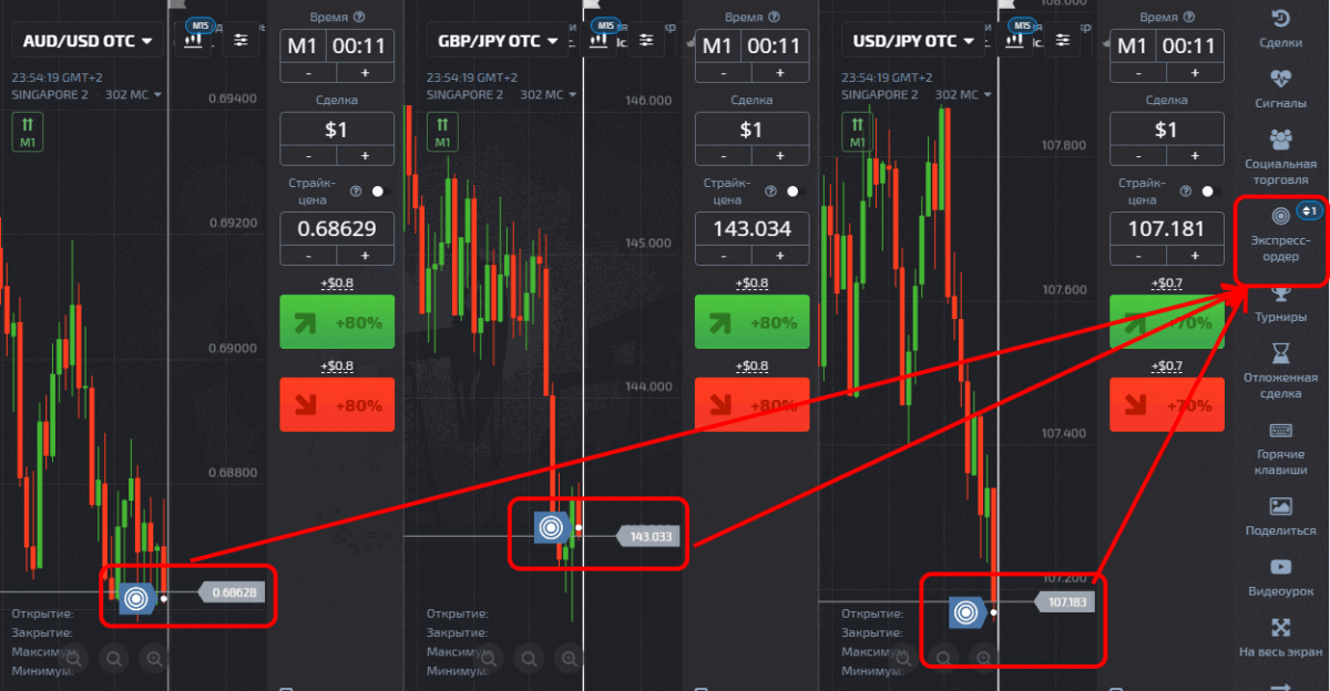 В рабочем интерфейсе торговой платформы ищем в правом меню опцию «Экспресс-ордер», где открывается список активов, с направлением, процентом премии и сроком экспирации. Примерно так: