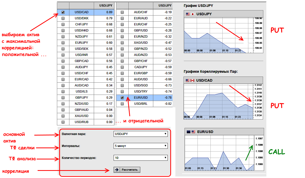 Перед тем как торговать экспресс опцион, нужно определить, например, валютные пары с сильной корреляцией (положительной или отрицательной), это поможет точнее определить направление для краткосрочных сделок.