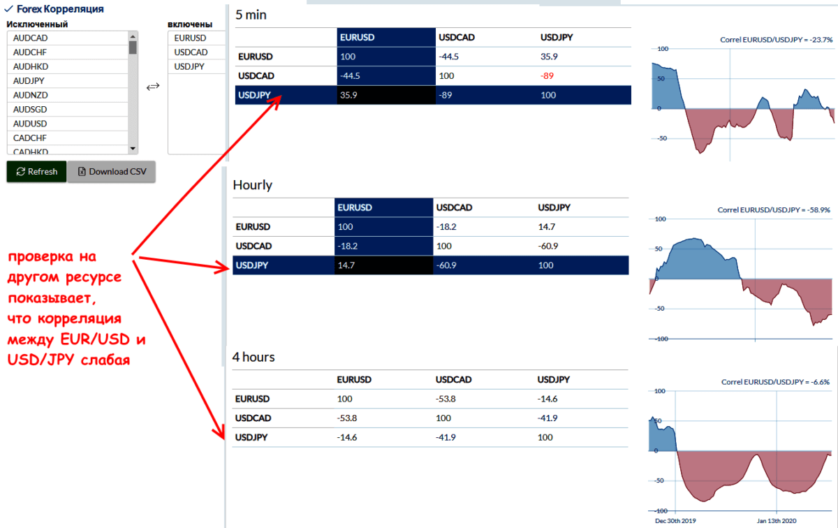 Напоминаем, что корреляция – динамический и весьма неустойчивый параметр, особенно на малых периодах. Рекомендуем проверять текущие данные на нескольких ресурсах, иногда могут быть неприятные моменты, как на скрине ниже. Расчет с такими же параметрами показывает, что взаимная корреляция между выбранными инструментами значительно слабее, причем на всех периодах: