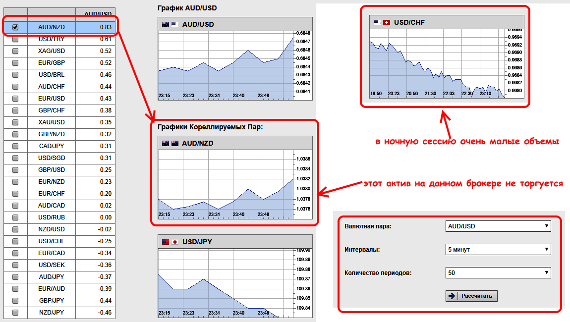 Корреляцию можно оценить визуально или посчитать вручную, можно применить специальные индикаторы в MetaTrader, но проще всего воспользоваться сервисами для такого расчета на бесплатных информационных ресурсах. Считаем один из активов ведущим, а период расчета выбираем соответственно периоду опциона. Примерно так: