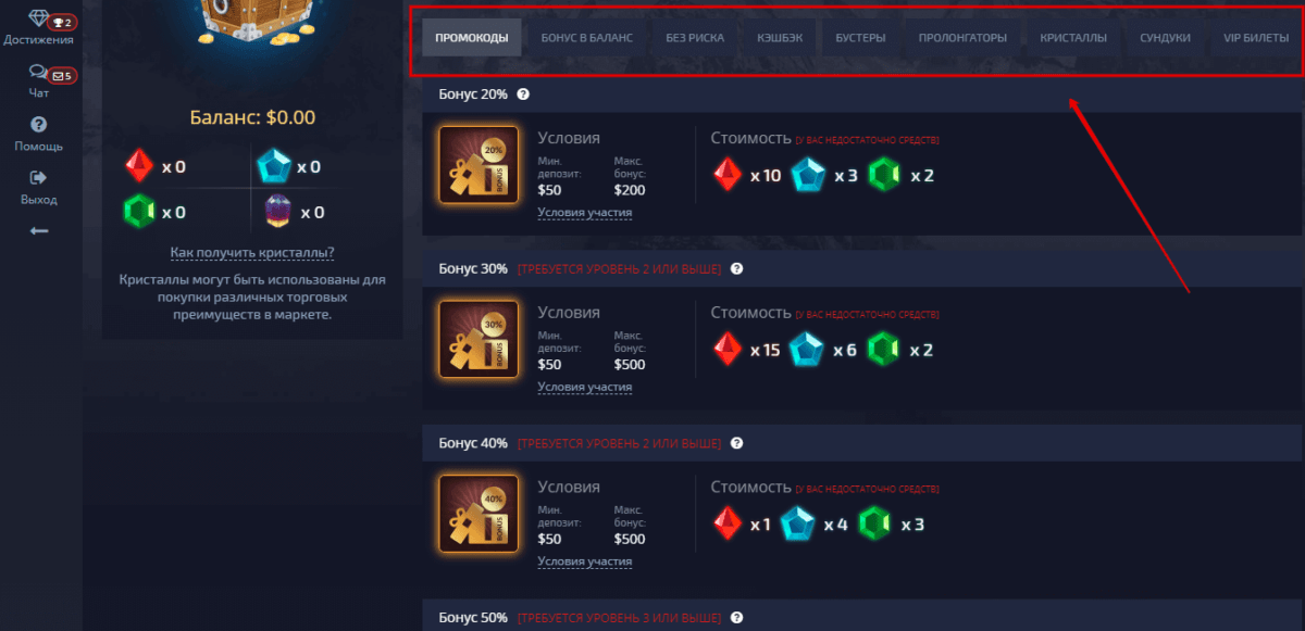 Совсем необязательно тратить средства для покупки бонусов. Их можно получить, осуществляя торговлю. Чтобы понять, какие именно операции нужно провести, достаточно открыть раздел достижений на сайте. Они разделены на три объемные группы: