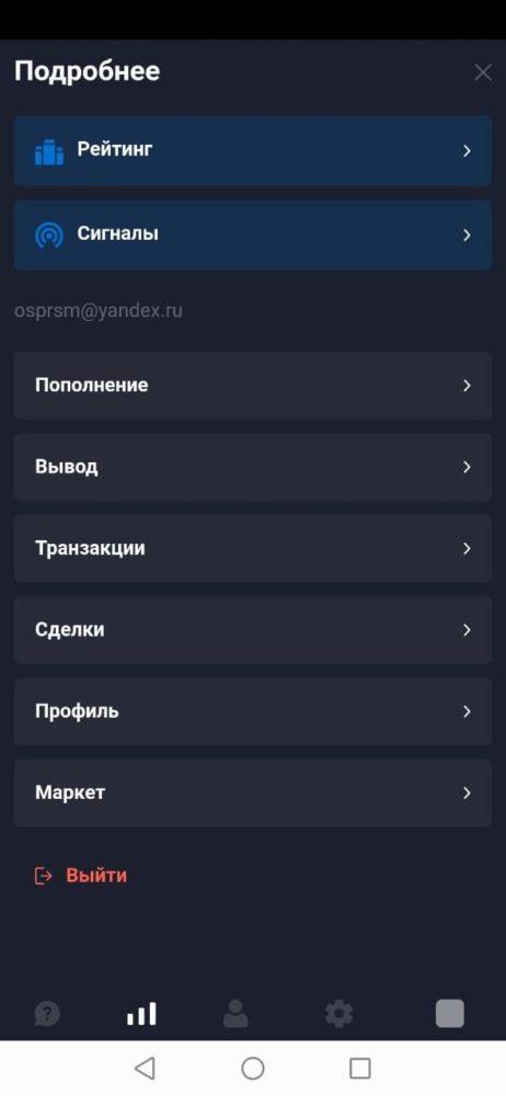 Здесь расположен функционал пополнения и списания средств с торгового депозита, просмотра истории проведенных транзакций и истории сделок. Здесь же располагается информация о текущем положении биржевого игрока при условии его участия в рейтинговых активностях, а также сигналы. Об этом разделе подробнее рассказывается далее.