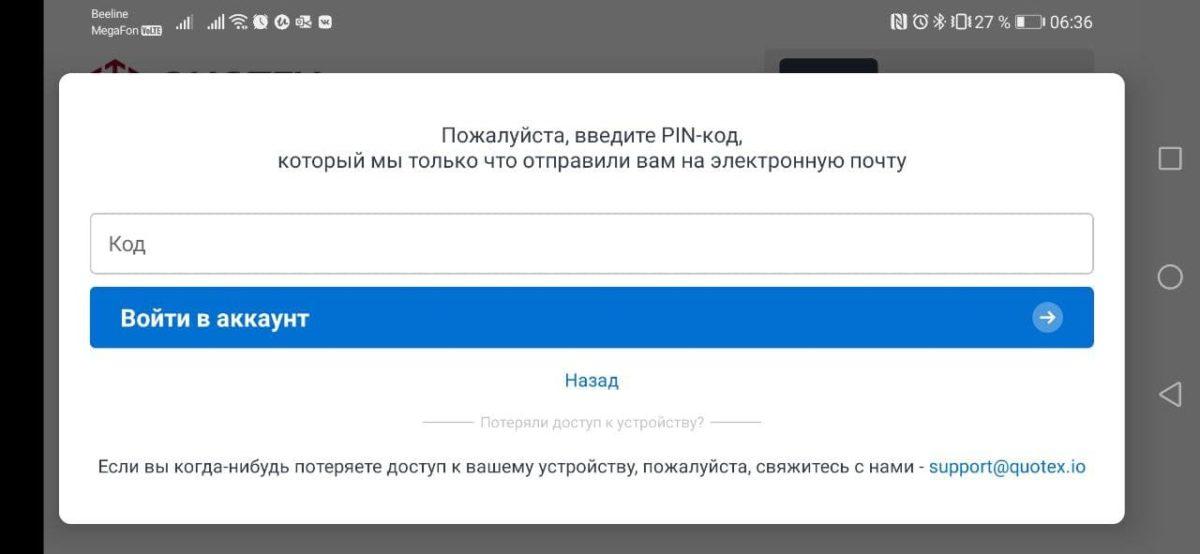 Зарегистрировавшись или пройдя авторизацию, трейдер попадает в меню торгового приложения. При установке двухфакторной аутентификации (далее рассказывается, как произвести данную настройку), необходимо подтверждение входа вводом пин-кода, направляемого на зарегистрированный адрес электронной почты.