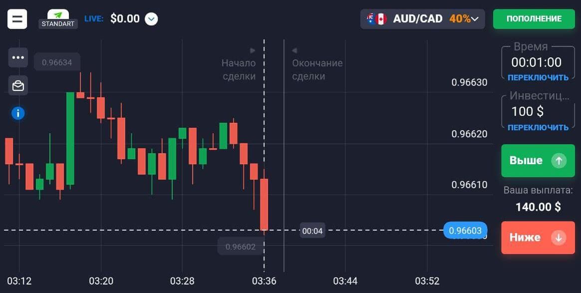 Здесь проводятся сделки с бинарными опционами, доступны озвученные ранее настройки режима отображения тренда и история сделок. Чтобы открыть позицию, достаточно ввести желаемый объем ордера, время его экспирации и выбрать направление — выше или ниже текущей цены.