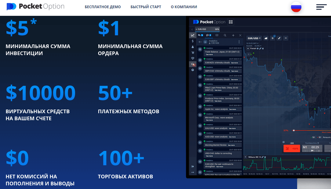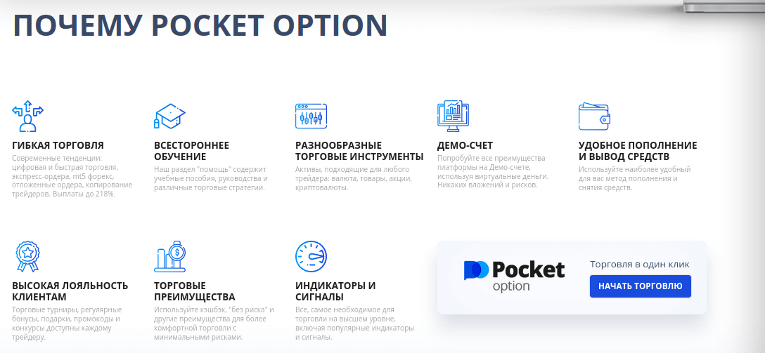 Официальный сайт Pocket Option — один из самых посещаемых ресурсов трейдерами бинарных опционов. Недавно портал кардинально обновился и теперь предлагает пользователям все необходимые инструменты для ведения прибыльной деятельности — от трейдерских терминалов под все современные платформы до первоклассной системы обучения.