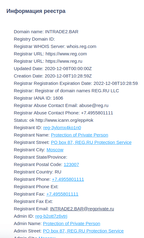 Перед началом любого подобного расследования принято проверять компанию по формальным признакам на отсутствие отрицательных факторов в работе. Первый этап запросы к регистрационным данным зеркала официального сайта Интрейд Бар.