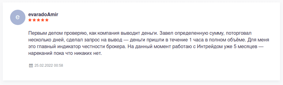 Подтверждает слова коллеги и следующий автор. По его убеждению, первое, на что нужно проверять выбранного брокера — на скорость вывода денег с депозита. В Intrade.Bar с этим справляются на отлично. Особенно когда запрошенная транзакция выполняется в течение 1 часа. И спорить с тем, что это один из основных показателей честности компании, не приходится.