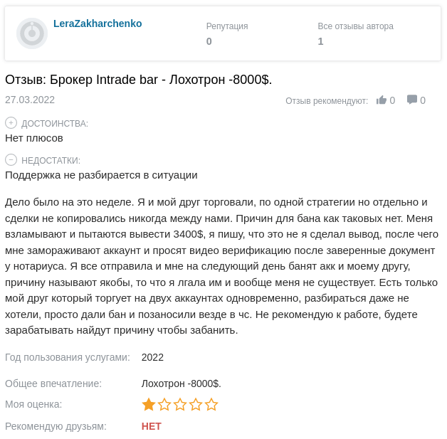 Не лишним будет разобрать и существующие об Интрейд Бар реальные отзывы негативного толка. Следующий автор отрицательного фидбека пишет, что компания заблокировала личный кабинет по подозрению в использовании нескольких учетных записей одним человеком, что категорически запрещено. Далее была проведена стандартная проверка личности с запросом документов, в том числе юридически значимых (с заверением нотариуса), однако в итоге в Интрейд Бар усомнились в существовании личности второго владельца.