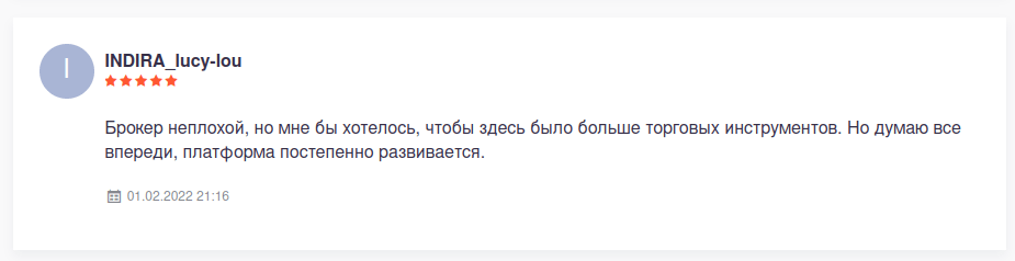 Одна из наиболее дельных претензий — небольшой список торговых инструментов. Для создания сложных торговых стратегий этот фактор может быть существенным недостатком, что повлечет за собой необходимость выбора другой компании в качестве посредника при предоставлении услуг трейдинга. О наличии подобных проблем указывает автор следующего фидбека.