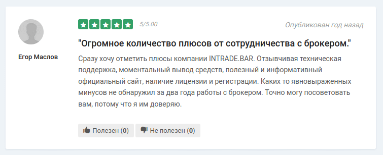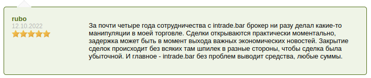 Я начал торговать с Интрейд Бар около года назад и очень доволен. Платформа интуитивно понятна, а вывод средств занимает всего 1-2 дня. Рекомендую!