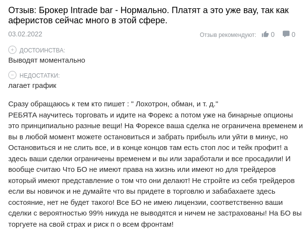В новом обзоре рассмотрим, какие отзывы о Интрейд Бар можно найти на финансовых форумах и специализированных сайтах. Бинарные опционы — высокоприбыльная сфера биржевой деятельности, но только при условии работы через надежного брокера, найти которого в современных условиях может представляться довольно серьезной проблемой. Все потому, что порог входа в рынок для предоставления подобных услуг довольно низкий и на рынке часто появляются откровенные мошенники, вычислить которых можно только по большому числу отрицательных отзывов о выводе денег и других сторонах функционирования определенной фирмы.