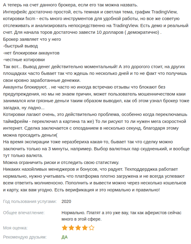 Касательно самой компании претензий не высказывается. Причин тому множество, но среди основных — авторитет брокера на рынке, сложенный за много лет стабильной работы, удобные «фишки», вроде графиков от TradingView и котировок от ведущих мировых поставщиков, а также главное преимущество — оперативная скорость обработки заявок на вывод денег. Как правильно упоминается в статье, сам факт того, что бинарный брокер платит, говорит о многом. Самое главное — о том, что здесь можно постоянно и стабильно зарабатывать.